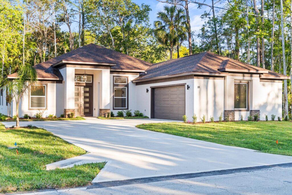 Full stucco exterior with a textured finish and decorative stucco banding per plan. Vinyl fascia and vented soffits in musket brown or white keep the roofline clean and ventilated. Structurally engineered roof trusses and rain gutters round out a weather-ready exterior.