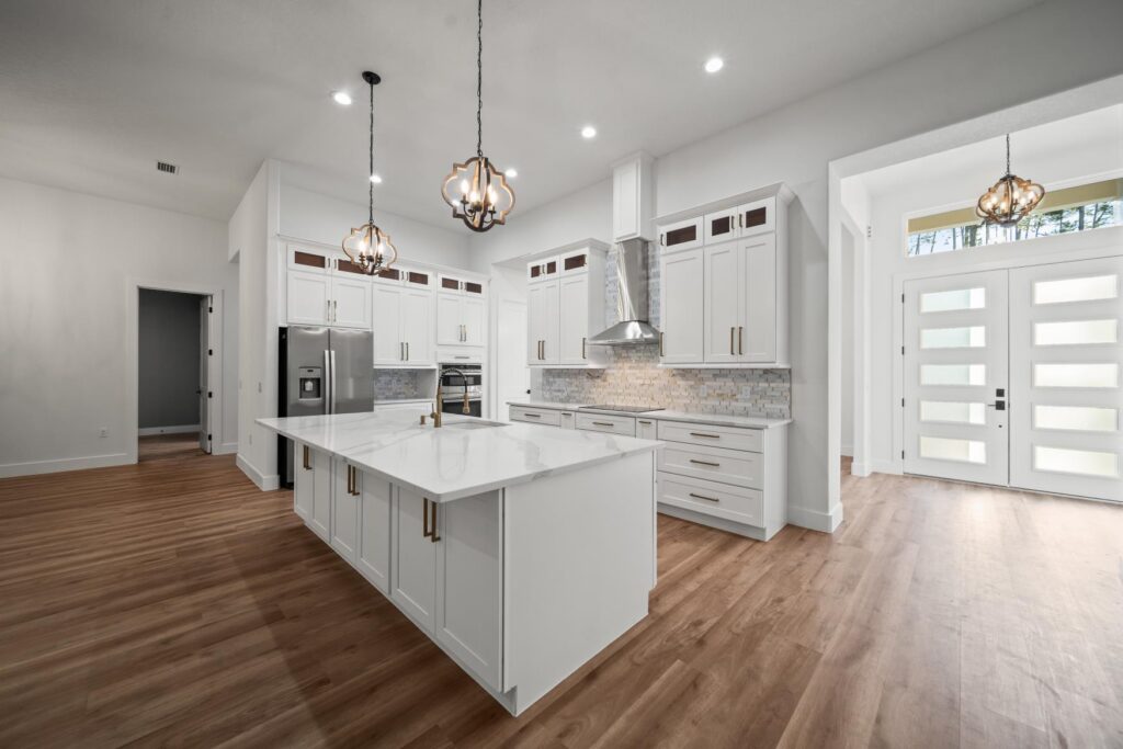 Quartz countertops paired with all wood cabinets featuring 42″ uppers, soft close doors, and crown molding. A deep farm style sink, backsplash tile, and a water pot filler add both function and style. Stainless steel appliances including a refrigerator come standard.