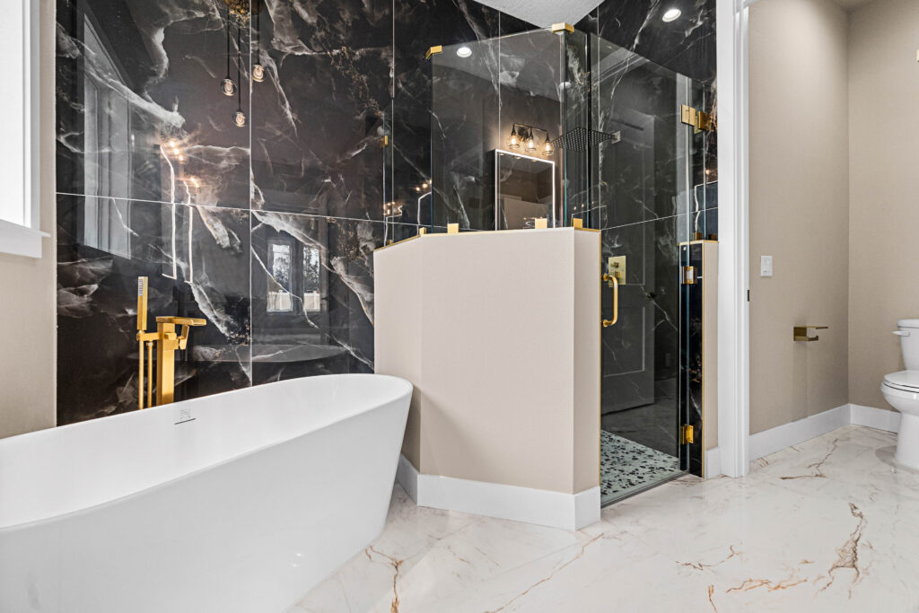 Tile is taken all the way up to the ceiling in baths and showers, with glass doors on all walk-in showers for a modern, open feel. Faucets are available in brushed nickel, black, or gold, and all plumbing fixtures are Delta or Moen brand for lasting quality.