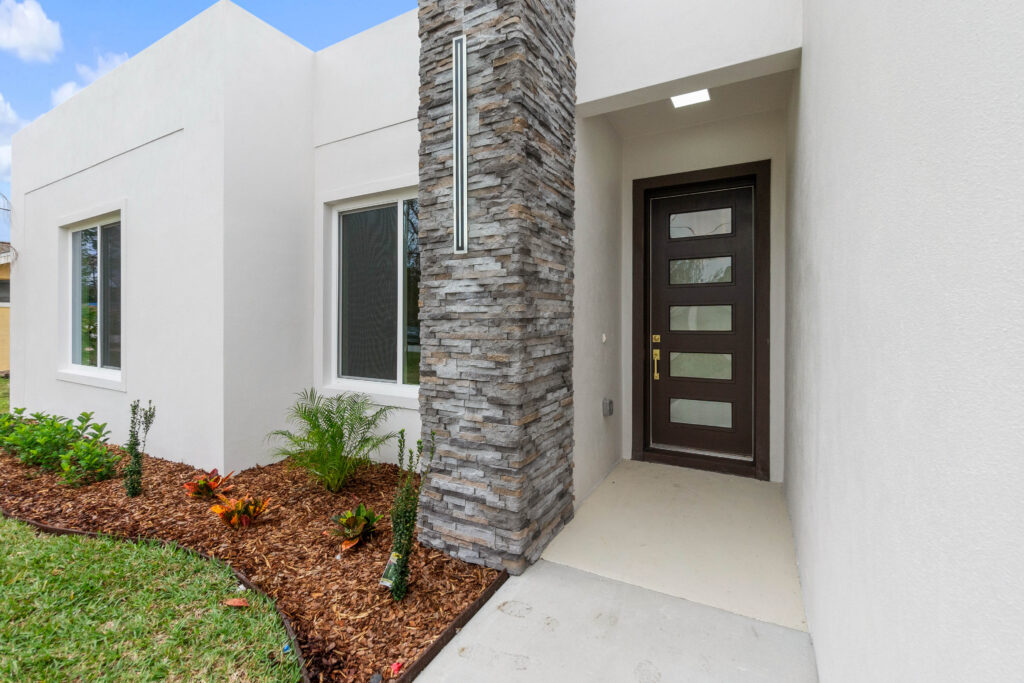 Concrete block exterior walls offer superior strength and storm resistance, paired with 2×4 and 2×6 interior framing for flexible wall construction. Hurricane straps are installed throughout to secure the roof structure to the walls during high winds.